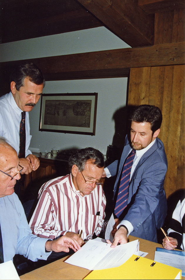Seit den Achtzigerjahren ist in den USA ein dritter Produzent zu den Pionieren Mathys und Straumann hinzugekommen. Geleitet vom Berner Hansjörg Wyss und begünstigt von einem riesigen attraktiven Markt überflügelt Synthes USA umsatzmässig ihre beiden Partner innert weniger Jahre deutlich. Das Bild oben zeigt Hansjörg Wyss (sitzend) 1992 anlässlich einer Vertragsunterzeichnung mit Rudolf Maag von Stratec und Reiner Mathys (rechts). 1999 übernimmt Wyss die aus Straumann hervorgegangene Stratec im Kanton Baselland und fasst damit auch in Europa Fuss. Die beiden Mathys-Brüder der zweiten Generation setzen gemeinsam mit dem von Sulzer geholten Manager Erwin Locher ebenfalls auf Expansion und erzielen mit der «Mathys Medizinaltechnik Bettlach» ein fulminantes Wachstum. Gleichzeitig gerät das Geschäftsmodell des Verbundes von Chirurgen und Produktionsfirmen ab Ende der Neunzigerjahre zunehmend in den Fokus der europäischen Kartellbehörden. Aufgrund drohender Bussen und weil die Absprachen obsolet geworden sind, entschliessen sich die Familien Mathys und Marzo 2003, das Osteosynthesegeschäft abzustossen. Damit verkaufen sie 90 Prozent der damaligen Firma Mathys an die inzwischen dreimal grössere Synthes-Stratec von Hansjörg Wyss. Zwischenzeitlich haben die Firmen weiter die Hand gewechselt. Ein Teil von ihnen firmiert unter dem Namen Johnson & Johnson, die eigentlichen Produktionsstätten gehören zum Konzern «Jabil». Das Bild unten zeigt die Brüder Robert Mathys junior (Mitte links) und Hugo Mathys (Mitte rechts), flankiert von Erwin Locher (rechts) und Finanzchef Herbert Betschmann (links).